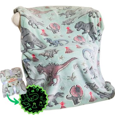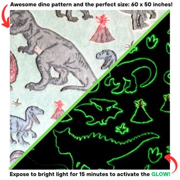 60" x 50" Glow in the dark dinosaur blanket featuring TREX, Carnotaurus, Dilophosaurus, Pterodactyl, Velociraptor, Spinosaurus, and more! Light weight all-season use.
