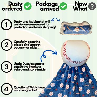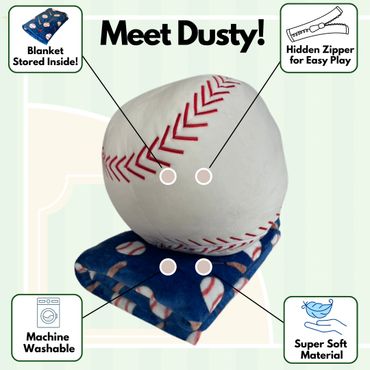 Dusty makes the perfect blanket, pillow, and toy combination for sports fans of all ages!