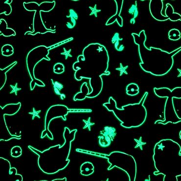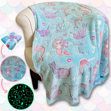 60" x 50" Glow in the dark narwhal and mermaid blanket featuring a purple narwhal, a pink narwhal, swimming mermaids, and a beautiful pearl holding clam! Light weight all-season use.