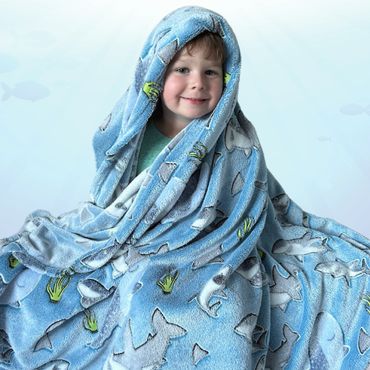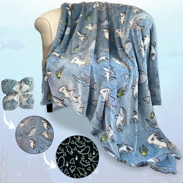 60" x 50" Glow in the dark shark blanket featuring Great White, Hammerhead, Mako, Whale, and Blue Sharks! Lightweight all-season use.