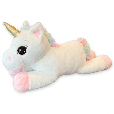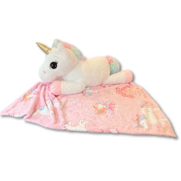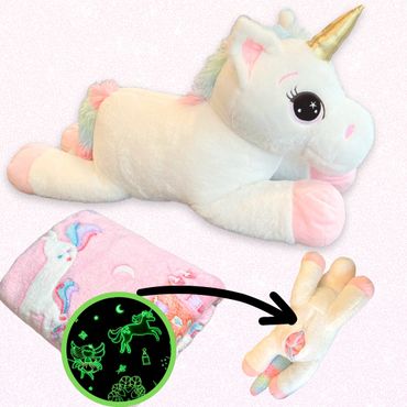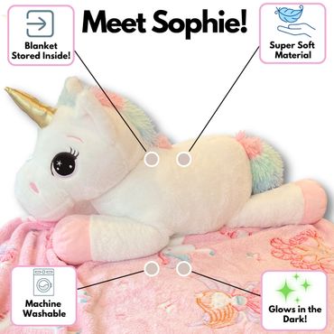 Sophie the Unicorn is a 30" unicorn with a 60"x 50" glow in the dark unicorn blanket in her belly!